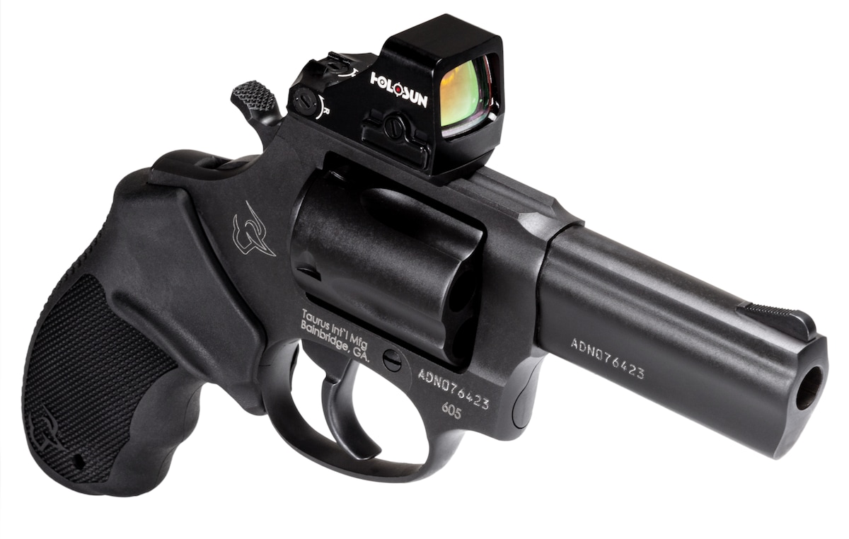 Introducing one of the first ever optics ready small frame revolvers, the Taurus 605 T.O.R.O. This revolver is milled at the factory to accept the optics plate designed specifically for this application. The plate itself accepts compact red dots designed for the Holosun K footprint. For example, you could take the new 605 T.O.R.O. and mount the Holosun EPS Carry on it and be ready to roll. The advantages to a red dot on a revolver are significant. Obviously, red dot sights are easier for many people to shoot. Additionally, a red dot can be zeroed to a specific grain weight or type of ammo, which wasn’t an option with a traditional fixed sight revolver.