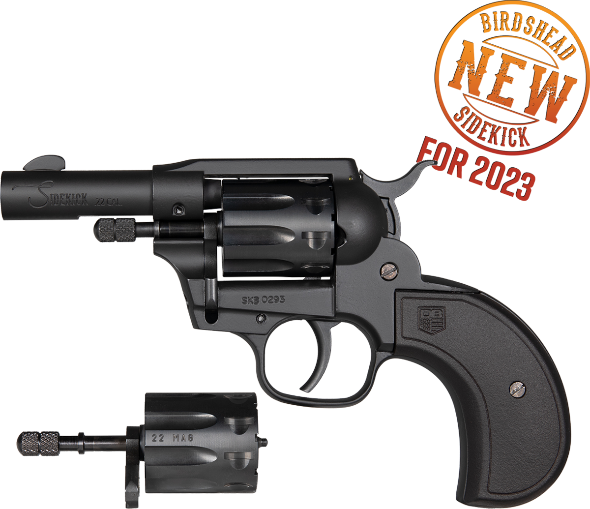We are proud to introduce the Sidekick Birdshead. This is the next line extension to the already popular Diamondback Sidekick. Like the original, the Sidekick Birdshead can quickly interchange 22 LR and 22 Mag 9-shot cylinders. Offered with a 3” barrel and a smaller overall envelope, the Sidekick Birdshead is the perfect companion when you need to be quick on the draw.
