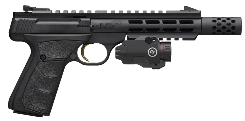 Blowback operated, single-action rimfire pistol with lightweight Vision barrel with aluminum outer sleeve and under barrel rail with Crimson Trace® Rail Master Pro Universal red laser and tactical light. Full-length Picatinny optics rail. Pro-Target adjustable rear sight.