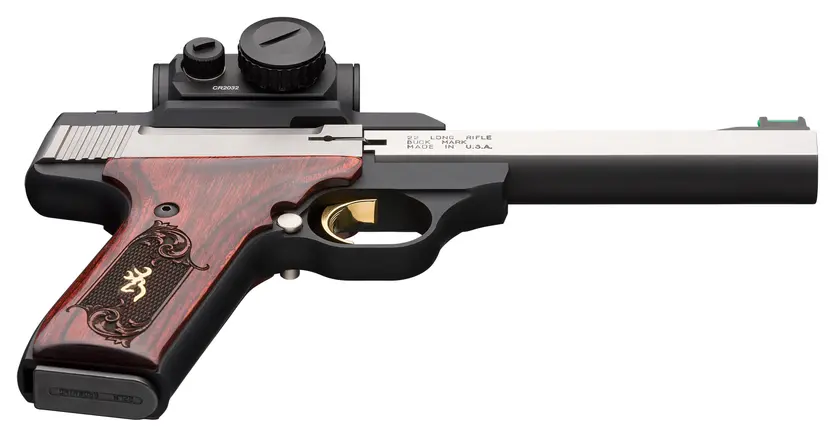 .22 LR autoloading pistol with blackened stainless steel slab side barrel with polished side flats, laminated rosewood-colored grips with gold Buckmark, co-witnessing fiber-optic front sight and windage adjustable rear sight. Vortex Crossfire Red Dot Sight.