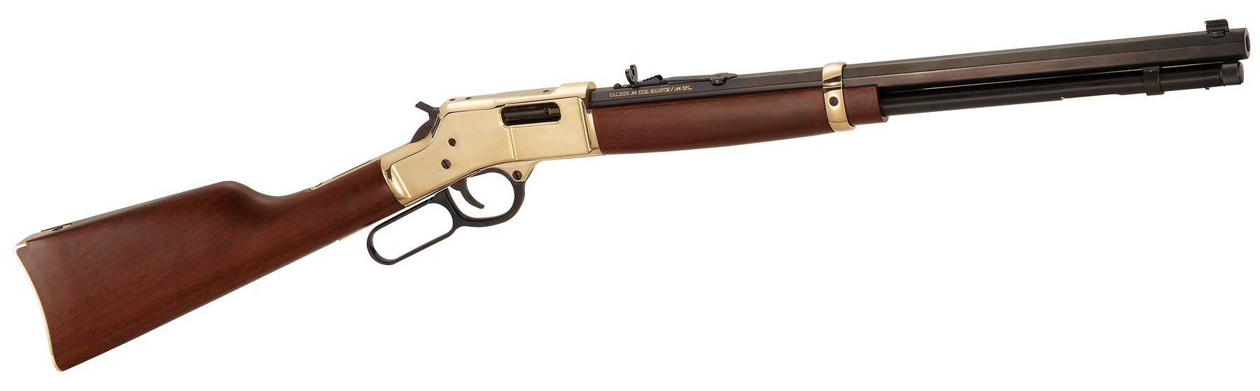 The Big Boy Classic is a Western-style lever action centerfire rifle. The Big Boy Classic features an American walnut straight grip stock and forearm solid brass receiver octagonal blued steel 20 barrel fully adjustable semi-buckhorn with reversible white diamond insert rear and brass beaded front sights sliding bar safety system tubular magazine and brass buttplate and barrel bands. Available in several calibers including 44 MagnumSpecial 45 ACP 357 Magnum38 Special 41 Magnum or 327 Federal Mag. DETAILS Action Lever Action – Caliber 44 MAG 44SP – Capacity 10 – Front Sight White Diamond Insert and Brass Beaded – Rear Sight Adjustable Marble semi-buckhorn – Barrel 20 – Twist 1.38 – Stock Straight-grip American walnut – Finish Solid top brass receiver brass buttplate and brass barrel ban – Weight 8.68 lb. – Overall Length 38.5 – Back when the West was still wild and the rifle was the tool of choice for survival and frontier justice the venerable 44-caliber put more meat on the table and outlaws in the ground than any other bullet – The West may have been tamed and fenced long ago but its unbridled spirit lives on in this line of traditional big-bore Henry rifles – Choose from .44 Magnum 45 Colt and 357MAG. All are SASS approved so Cowboy Action shooters who enjoy stepping back to that bygone era can use them in competition. – Dont let the retro look fool you these rifles are much more than shootin irons for todays new breed of cowboy. – Theyre also the unbeatable choice of big-game hunters who prefer the traditional look feel reliability and accuracy that comes from an authentic Henry rifle. – The traditional 20 octagonal barrel is outfitted with a classic fully adjustable semi-buckhorn rear sight with a reversible white diamond insert and a brass beaded front sight. The tubular magazine tops off at 10 rounds. – Both the straight-grip stock and forearm are crafted of select American walnut accented with a brass barrel band and Henrys recognizable brass receiver. All have that crisp smooth action that sets an authentic American-made Henry apart from other lever action rifles on the range and in the woods today. – The .44 Magnum can also shoot .44 special rounds and the .357 Magnum can also shoot .38 special rounds. UPC 619835018007 Caliber .44 MAGNUM Action LEVER ACTION Capacity 10 ROUNDS Barrel Length 20 BARREL Weight 7.6 LBS. Finish BRASS