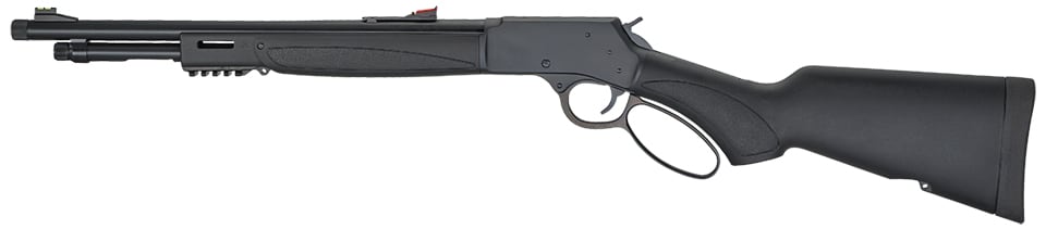 Action Type: Lever Action – Caliber: .45 Colt – Capacity: 7 Rounds – Barrel Length: 17.4 – Barrel Type: Round Blued Steel – Rate of Twist: 1:16 – Overall Length: 36.3 – Weight: 7.3 lbs. – Receiver Material: Steel – Receiver Finish: Blued Steel – Rear Sight: Fully Adj. Fiber Optic – Front Sight: Fiber Optic – Scopeability: Drilled and Tapped – Scope Mount Type: BB-RSM – Stock Material: Black Synthetic – Stock Style: Pistol Grip – Buttplate/Pad: Black Solid Rubber Recoil Pad – Length of Pull: 14 – Safety: Transfer Bar – Handing: L/R – Embellishments/Extras: Swivel Studs Large Loop Lever M-Lok Picatinny Rail Threaded Barrel Fiber Optic Sights UPC 619835200242 Caliber .45 LC Action LEVER ACTION Capacity 7 ROUNDS Barrel Length 17.4 BARREL Weight 7.3 LBS. Finish BLACK Receiver Material STEEL Receiver Finish BLUED