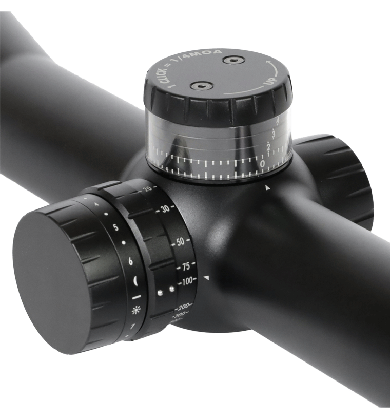 An integrated customizable ballistic turret allows shooters to reliably and accurately dial for bullet drop, and three different numbered, movable rings, can be set to custom distances for quick dialing. Audible and tactile turret mechanics provide sure, intuitive operation and a Zero Mode means shooters can quickly get back to zero without coming off the optic.