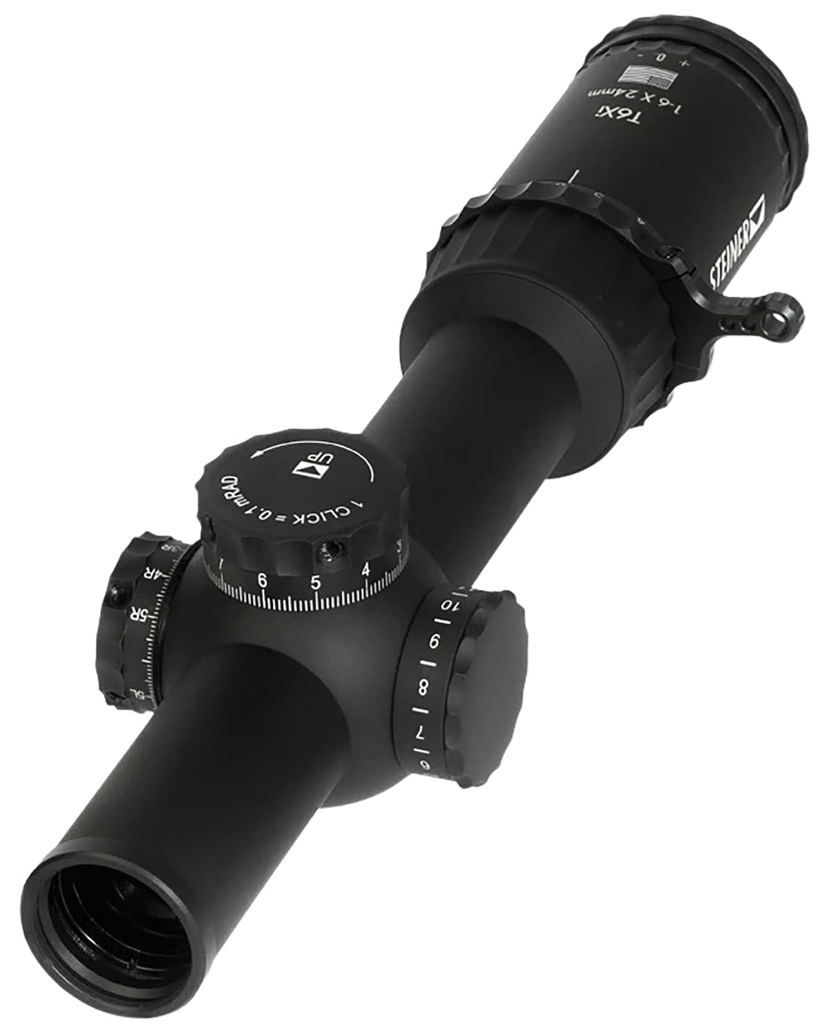 The T6Xi 1-6×24 riflescope features the Steiner KC-1 reticle, designed for quick target acquisition at 1x and precise shooting and positive identification at 6x. Included are both exposed and capped elevation turrets for user or department preference and feature a diopter locking ring to prevent inadvertent movement once the reticle is focused on the user’s eye. The T6Xi models include a throw lever for rapid and confident magnification changes, even while wearing gloves.