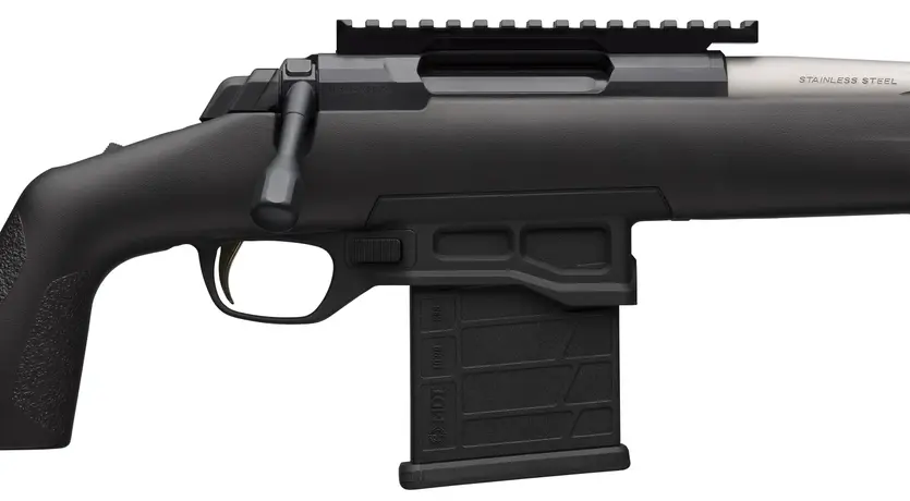 New in 2023 — A new Browning bolt-action rifle optimized for long-range target shooting and competition. Features include a stiffer, heavier receiver, fluted stainless steel sporter weight barrel with Recoil Hawg muzzle brake on 5/8″-24 suppressor-ready threads, adjustable Target DLX trigger, extended bolt handle and adjustable MAX composite stock.