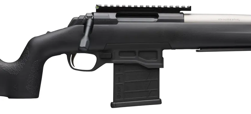 Specialized bolt-action target rifle aimed at production class competitions. Heavy bull barrel with Recoil Hawg muzzle brake. Nylon filled MAX stock with vertical grip. Factory-installed ARCA/Swiss rail for additional mounting options and faster adjustment.